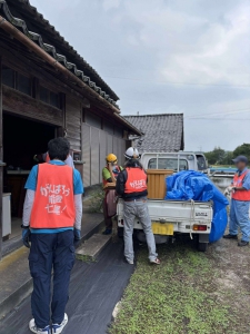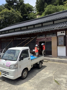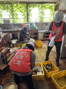 金沢大学の学生さん4人含む7人で、能登島二穴町のお宅に。20年ほど空き家にしていたがこれを機に解体ということで金沢から息子さん夫婦がいらっしゃって一緒に活動しました。最高気温34・2度、平均湿度84%とかなり過酷な環境で、20分活動10分休憩と熱中症対策も万全に作業し、軽トラ4台搬出しました。母屋は終了しましたが、まだ納屋が手付かずで継続案件に。