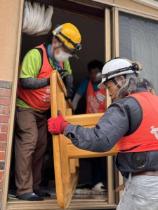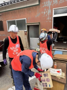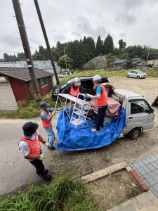 3件目は公費解体後の敷地に残ったごみの分別・搬出です。能登でこのような作業は初めてでしたが、8月初頭に行われる奉燈祭に向けての町内美化作業ということのようでした。お祭りの時には被災後離れていた人たちも戻ってきます。その時に少しでも復興の歩みが進んでいる様子を感じてもらえることがUターンの原動力になるという事で、東日本大震災の復興作業でも行ったことがあります。
