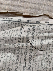 朝から熱中症アラートの中8人のチームで川原町のお宅で自主解体予定の蔵の2階から、古い木の箪笥や大きな長持を運び出す活動を行いました。公費解体ではないので大型家具を残置出来ないという案件です。ダンプ2台分、軽トラ2台分の家財を搬出しました。蔵には古い新聞がたくさんあり、もっとも古いものは明治37年。日露戦争の記事が掲載されていました。