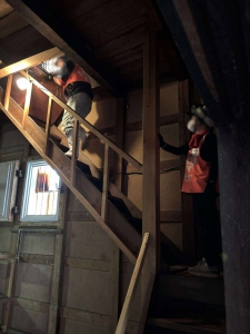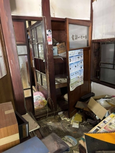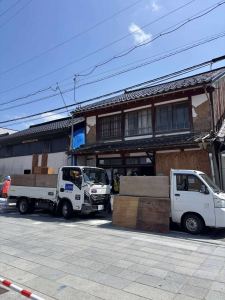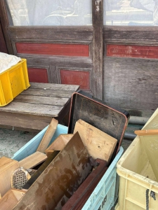 この日はまず、アメリカから夏休みで日本に帰国中の4人家族のボランティアさんと引越をお手伝いをしました。赤浦町にある築100年のお宅から町内に新築した平屋へ箪笥を二竿、サイドボード、ベッドを運びました。量は然程ではなかったのですが、立派な調度で重量があり、大きさ的にも廊下の角を回したり部屋の戸口を通すのも中々難儀したので午前中いっぱい時間を使いました。午後は、歴史的街区の一本杉町で自費解体の工場兼住居から家財を分別・搬出する活動をやっている別班に合流しました。こちらもの築100年を越えた建物で、紅殻格子の引き戸や電話部屋などから歴史を感じます。20人弱のボランティアで軽トラ4台、2tダンプ2台分運び出しましたが、到底終わらず、翌日に持ち越すこととなりました。この日は七尾市祇園祭(詳細は➢コチラ)のため街中の各所でキリコの準備が進められていました。