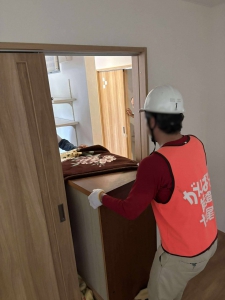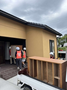2件目は公費解体の石崎町のお宅から祖浜の仮住まいと、田鶴浜のご実家に家財を引越するという活動でした。この日は基本、曇り空だったのですが、時折パラパラと降ることがあったので、ブルーシートで荷物を覆っての運搬です。祖浜には軽トラ1台分、田鶴浜には軽トラ2台分の家財を運搬しました。