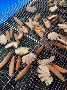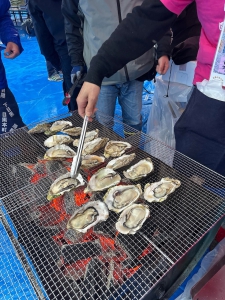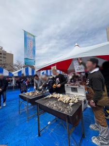 ブースでは、気仙沼から持ってきていただいた牡蠣やホタテ、カツオのハラス、カニ、メカジキのカマを、牡蠣は蒸し牡蠣に、他のものは炭火焼きにして提供しました。