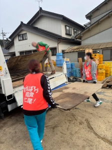 単身先のりしたユニコンメンバー1名が12名編成のチームで活動。ボランティア依頼は初めてという(一年経ってやっと発起する方も増えています)石崎町のお宅。こちらは公費解体でなく、まだしばらく住むという事で、生活空間を確保するために、廃棄するものを分別・搬出する活動。思い出の品も家主さんと相談しながら整理しました。