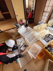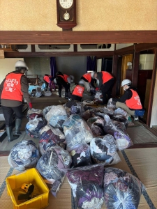 まず午前中は、七尾市古府町のお宅。既に大方分別頂いていましたが、 分別内容の確認と同時に、大きめの木材やカーペットの切断等を行 い、軽トラックに積み込み、倉庫に運んだところでお昼ごはんになってしまい終了。まだ手付かずのものが半分程度残ったので、家主さんの希望するペースに合わせて、残りの対応をし ていくことになりそうという事です。