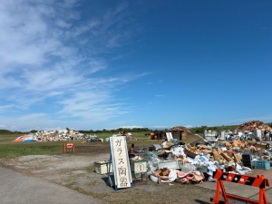 昨日の残務を福井から来たボランティアさんと組んで完遂しました。仮置き場に行く途中に細江地区のお宅に寄り、濡れて使用できなくなった55インチのテレビをピックアップするという新たなニーズも加えて行いました。こちらのお宅は新築したばかりで本当に出来立てのホヤホヤという建物でしたが、やはり窓ガラスが割れ、屋内が雨で水浸しになったほか、若干傾いてしまった部分もあるようだということで、もう一度しっかりと住宅メーカーさんに検査してもらう予定という事でした。周囲にはまさに建築中のお宅もありました。引き渡しもまだということで、修繕については家主さんの負担にはならないのではないかと思いますが、災害に遭うタイミングでいろいろ明暗が分かれることがあることを改めて痛感しました。この日はこの案件だけ行い午前中で活動は終わりました。吉田町もですが、技術系ボラの案件は多いものの一般ボラさんが対応出来るニーズというものは減っているようでした。