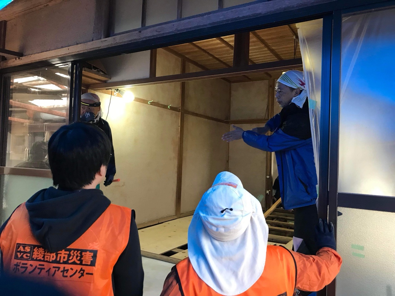 講習会では、綾部市での最後のニーズとして残っていた、床剥ぎをして泥土をかき出した和室にコンパネを貼り直すという作業が残っていたお宅が会場となりました。