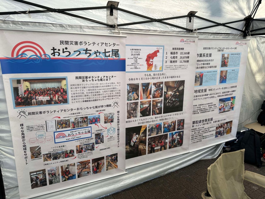 今回の出展は、能登町の柳田植物公園に「能登ボランティアキャンプ」を開設されていた「NPO法人ボランティアインフォ」さんの呼びかけで、能登半島地震・奥能登豪雨関連では「NPO法人ボランティアインフォ」さん、民間災害ボランティアセンター「おらっちゃ七尾」さん、輪島市町野町の方を中心に立ち上がり復興及び持続可能なまちづくりに関する活動を実施されている「町野復興プロジェクト実行委員会」さん、福島・能登等で継続的に活動されている「一般社団法人LOVE FOR NIPPON」さんがブースを出展されていました。