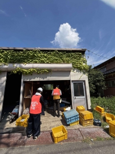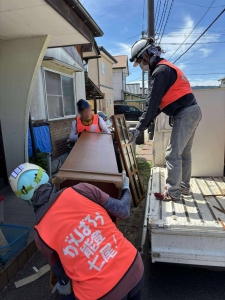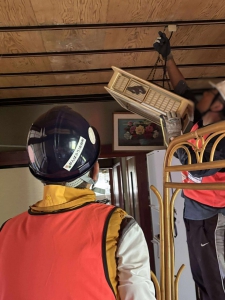 午前中は、私たちチーム・ユニコンのメンバー3名と、他ボランティアさん2名の計5名で、細口町のお宅へ。公費解体を前に、家の中の家財を運び出すお手伝いをさせていただきました。2階の部屋を中心とした作業でしたが、チームで連携し、無事に午前中のうちに作業を終えることができました。