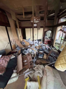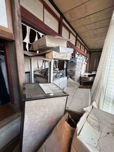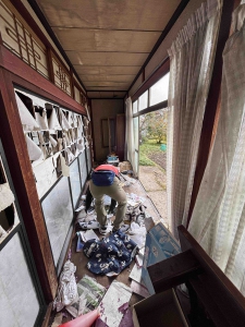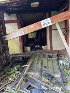 発災直後からご覧のような危険な状態で放置されていましたが、公費解体を執行するにあたり、安全な縁側だけでも整理してから業者さんにお渡ししたいという家主さんのたっての希望で、その部分だけ家財の分別・搬出を行いました。